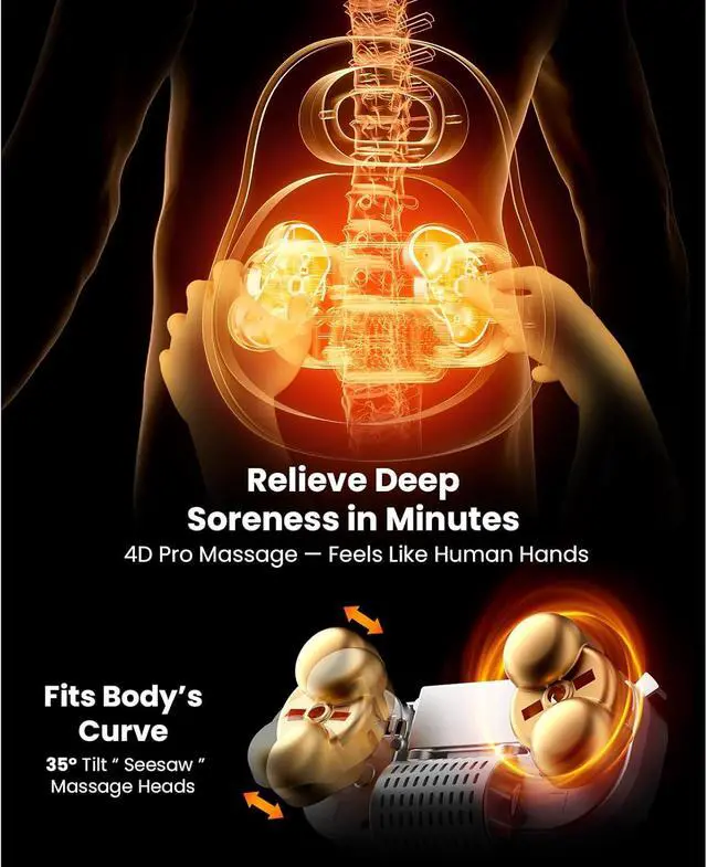 Deep Tissue Massage with Fishhook-style Nodes - Experience professional-level relief through two sets of four fishhook-style kneading nodes with varied heights that move vertically along your back,closely replicating the layered comfort and feel of human hands. It offers three rolling massage modesfull-back relaxation, targeted relief, and slow-fast alternationplus a dedicated spot function to precisely ease tension, delivering comprehensive comfort and accurate pain relief