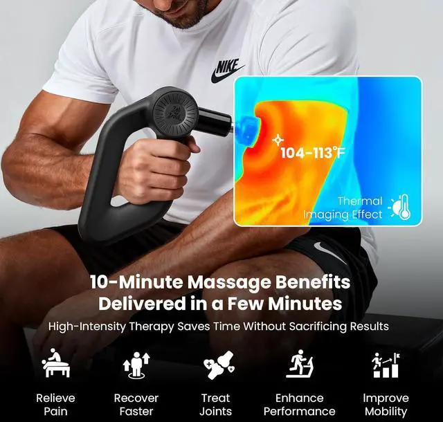Infrared Light Massage Gun for Post-Workout Recovery: The D6 Ultra massage gun, featuring a infrared light massage head, delivers a more efficient post-workout recovery program. The combination of deep muscle percussion and heat therapy promotes rapid blood circulation, effectively releasing muscle tension and fatigue. Whether after intense training or prolonged sitting, it provides targeted relief for soreness, tension, and stiffness, helping to prevent and treat muscle injuries.