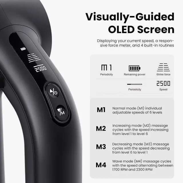 PD Fast Charging and Smart OLED Display: The D6 Ultra features a PD fast charging adapter and a 2500mAh automotive-grade battery, charging 50% faster than similar products for greater convenience. Its OLED display shows real-time speed, intensity and 4 built-in programs to keep you informed of power status and prevent interruptions to your massage. The 10-minute auto shut-off feature helps prevent potential muscle and bone damage from prolonged use.