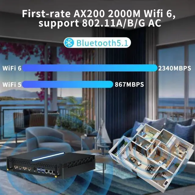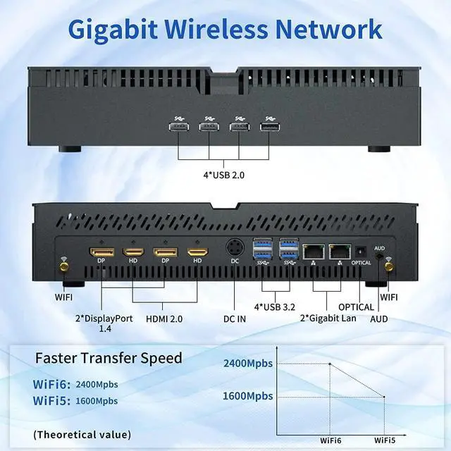 Mini computer built-in WiFi 6(802.11AX) and Bluetooth 5.1, support wireless Gigabit, transmission speed up to 2.4Gbps, enable faster and more stable without network congestion.