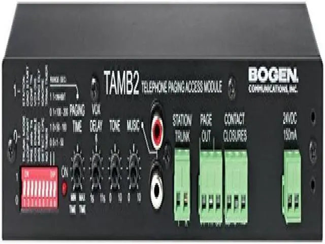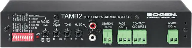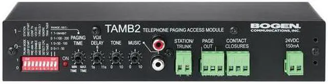The Bogen TAMB2/PS Telephone Access Module is a unique, dual-purpose voice paging adapter designed as an interface from a telephone system to a paging system. This versatile unit offers the capability of station port or trunk port operation, and is compatible with the full range of analog telephone port types. Advanced design and Bogen dependability make the TAMB2/PS the perfect choice for simple or complex telephone paging applications. A background music input (with stereo-combining RCA jacks and volume control), which will accept a linelevel input from a background music source, is provided.