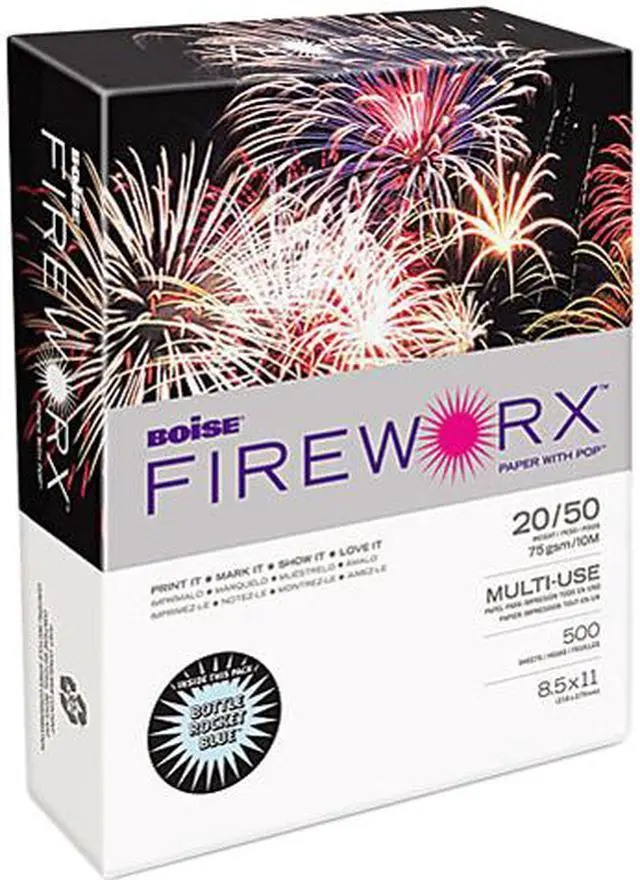 FIREWORX premium colored paper will help your documents stand out from the rest. Compatible with all printers and office equipment. This product was made from materials sourced from a certified managed forest. Size: 8 1/2 x 11; Paper Color(s): Bottle Rocket Blue; Paper Weight: 20 lb; Sheets Per Unit: 500.