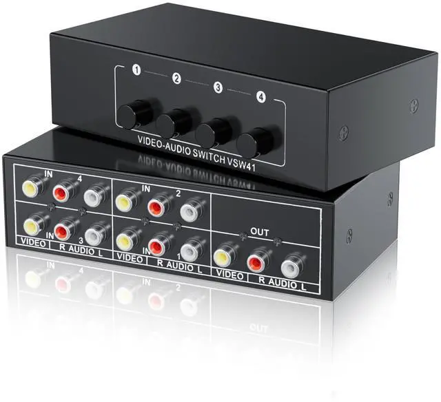 The BolAAzuL 4-Port RCA switcher 4 in 1 out composite audio & video selector box has four RCA input ports and one RCA output port.