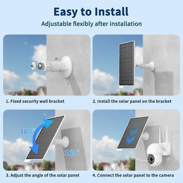[Installs in Minutes] - Fix the wall bracket using the provided screwsInstall the solar panel onto the wall bracketAdjust the angle of the solar panelConnecting the camera or other equipment
