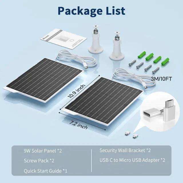 [Value Pack of 2] - This 2-pack of 9W solar panel chargers comes with 10-foot USB-C cable, 2 USB-C to Micro USB adapters, 2 wall brackets, 2 screw packs, and 2 quick start guides, enabling flexible installation in various environments