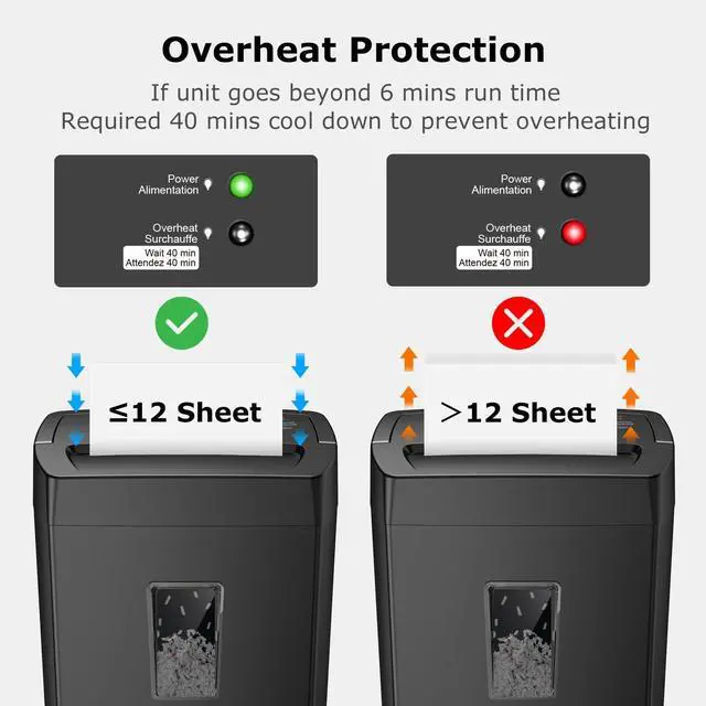 The cross-cut shredder will run continuously for 6 minutes before needing a 40-minute cool-down.