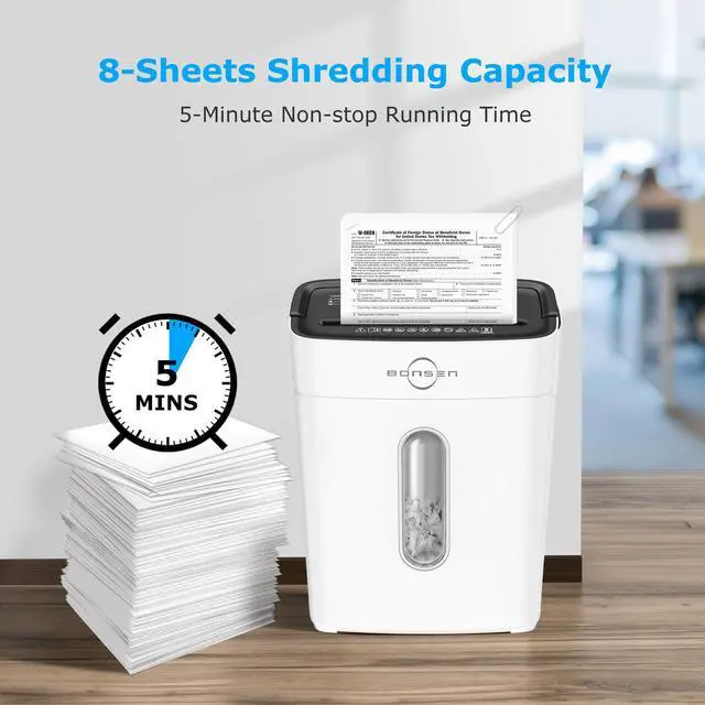 The shredder can shred 8 sheets of paper at a time, and can shred about 210 sheets of paper within 5 min of working time before 40-min cooling time
