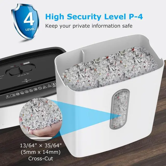 The home office paper shredder quickly shreds up to 8 sheets of paper into cross-cut particles measuring 5/32X1-12/32 inches (Security Level P-4). With anti-jamming protection, this home shredder can work more powerfully!