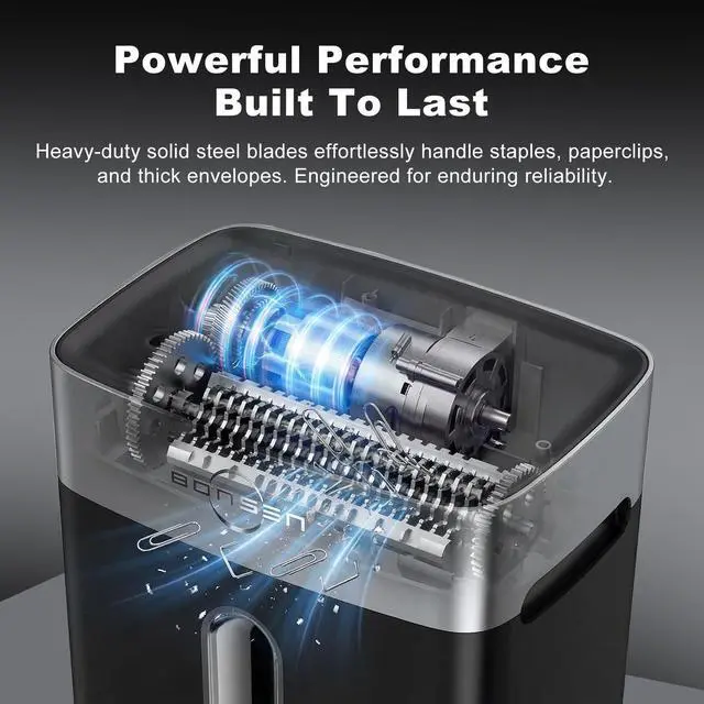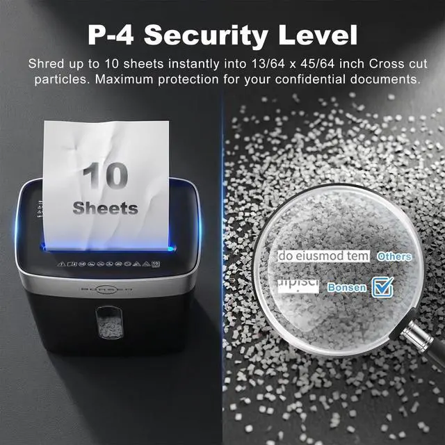 Shreds 10 sheets per pass into 13/64 x 45/64 inches" particles to help keep your information safe