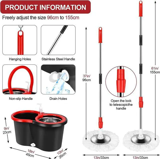 Adjustable Handle~~The telescopic mop handle allow you to adjust according to your height, so you don't have to bend over when cleaning. The stainless steel handle can be extended to 61 inch. The hook design on spin mop bucket set can save storage space for you.