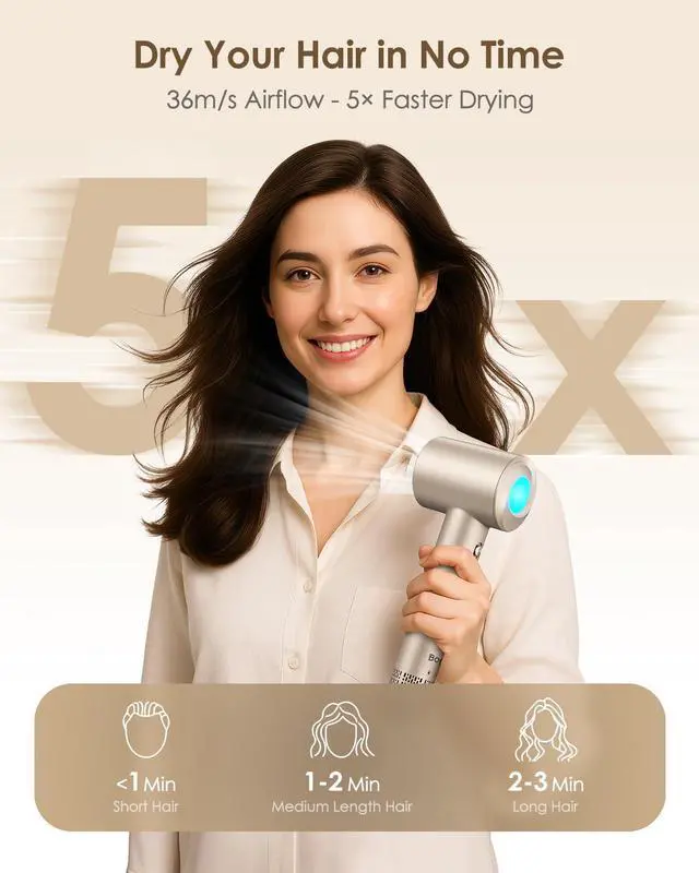 Powered by a 160,000 RPM high speed motor, this fast drying blow dryer delivers 36m/s airflow to dry hair in minutes. Perfect for busy mornings, post-gym routines, or quick styling at home.