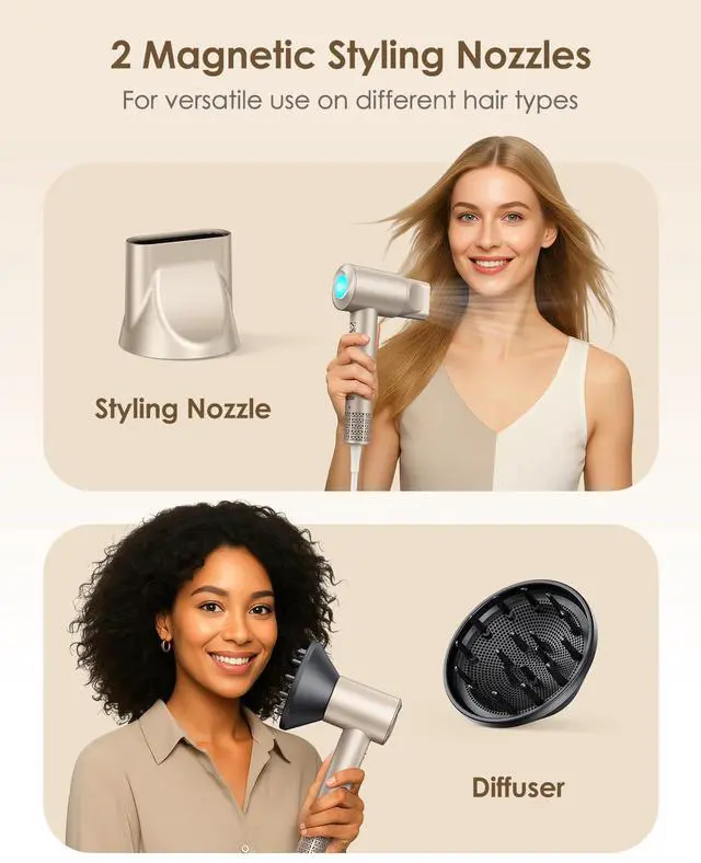 Includes a magnetic concentrator nozzle and black diffuser for curly hair,
