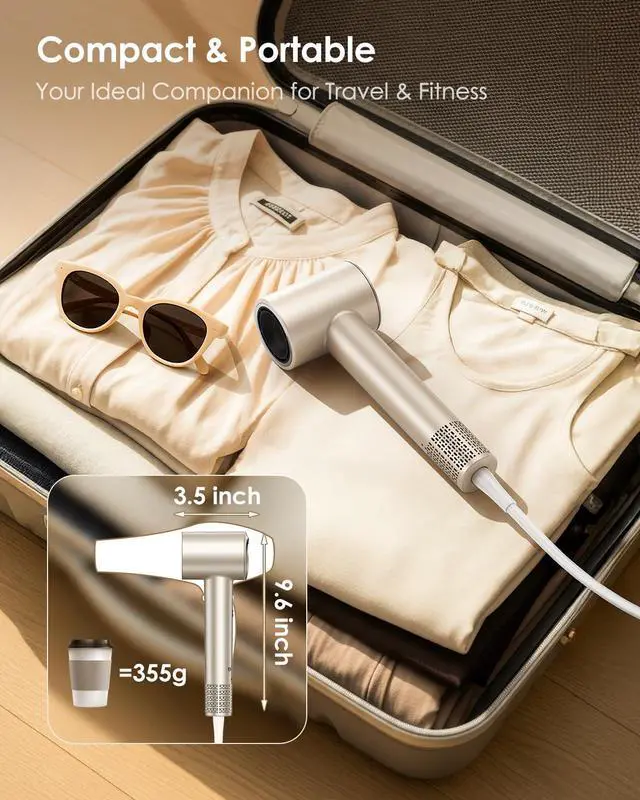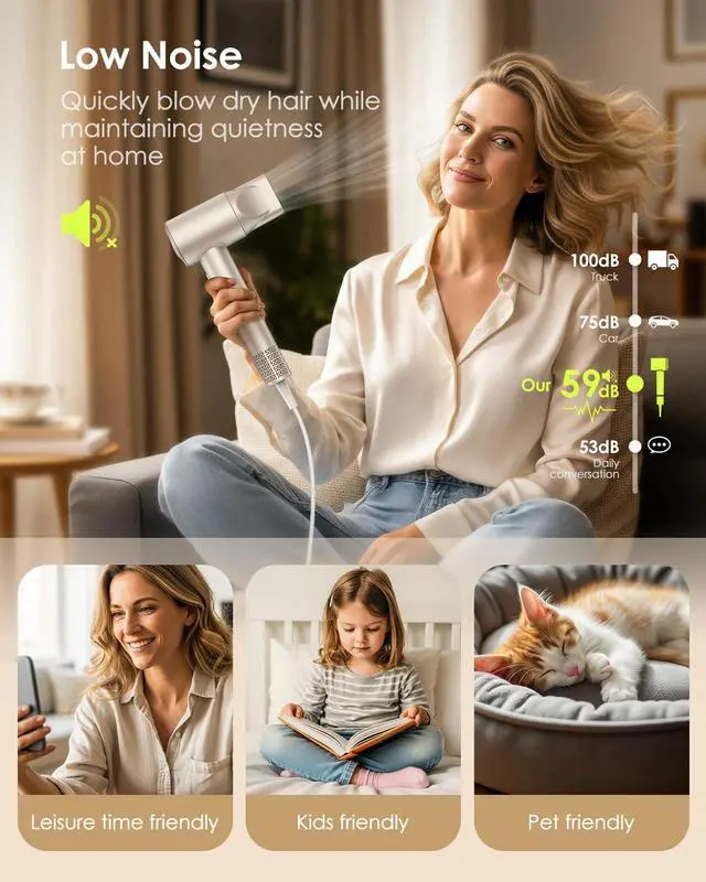& Engineered with a 59 dB quiet motor and an ergonomic champagne gold body, this lightweight hair dryer is easy to handle for long sessions, night use, dorm rooms, or family-friendly drying.