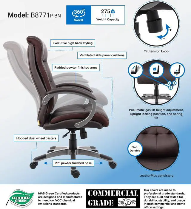 • Black upholstery w/ Silver arms and base (B8771S-BK) or Brown upholstery with Pewter arms and base (B8771P-BN).