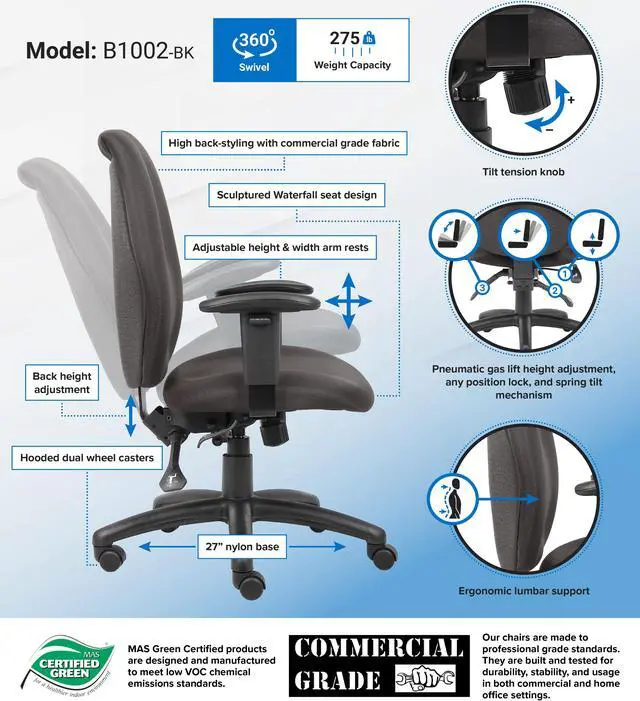 Note: *The BOSS Office B1002 Task Chair is available in four colors: Blue, Grey, Black, and Burgundy.