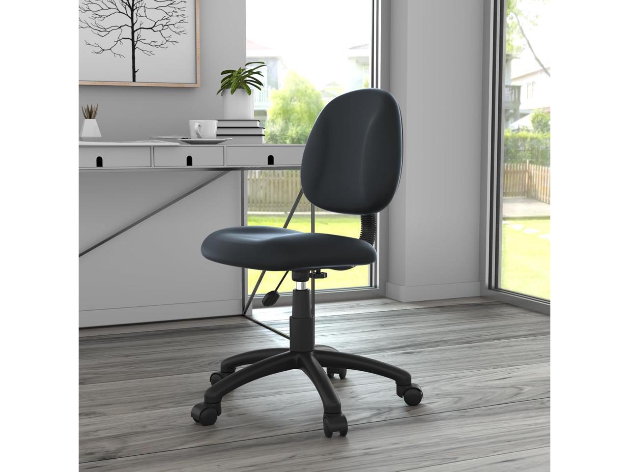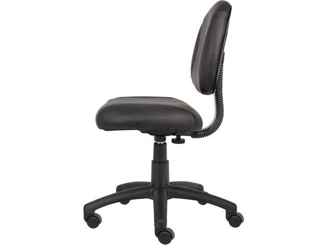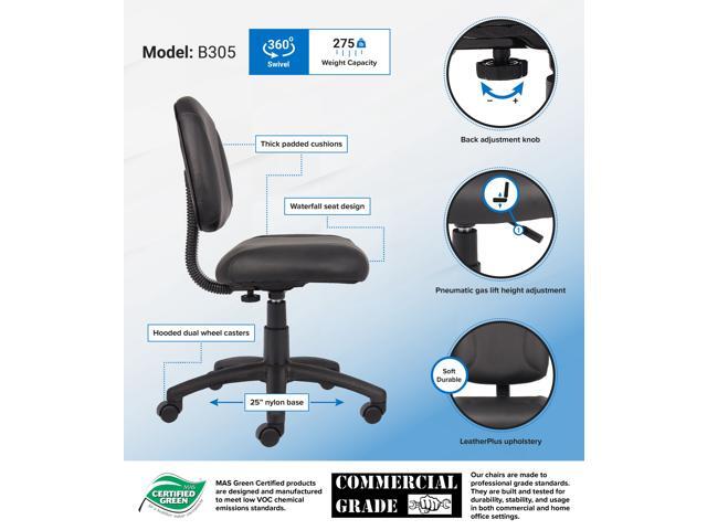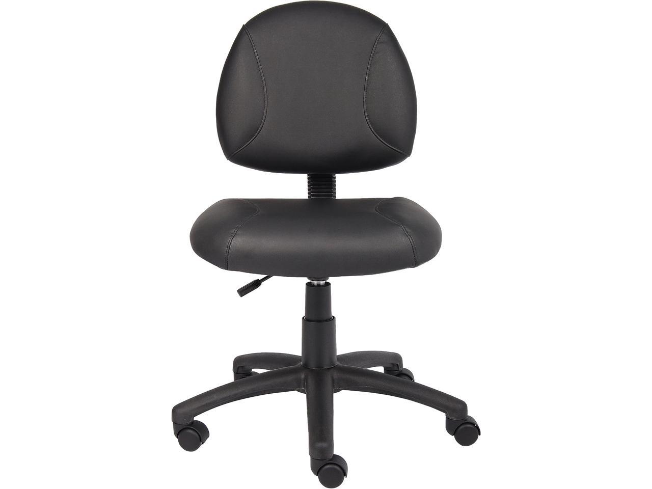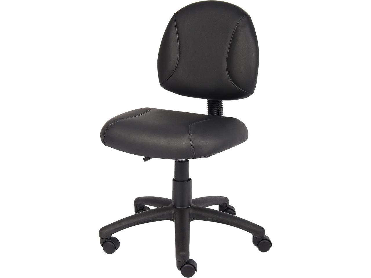 The Deluxe Posture Chair is upholstered in Black LeatherPlus (leather and polyurethane), for added softness and durability
