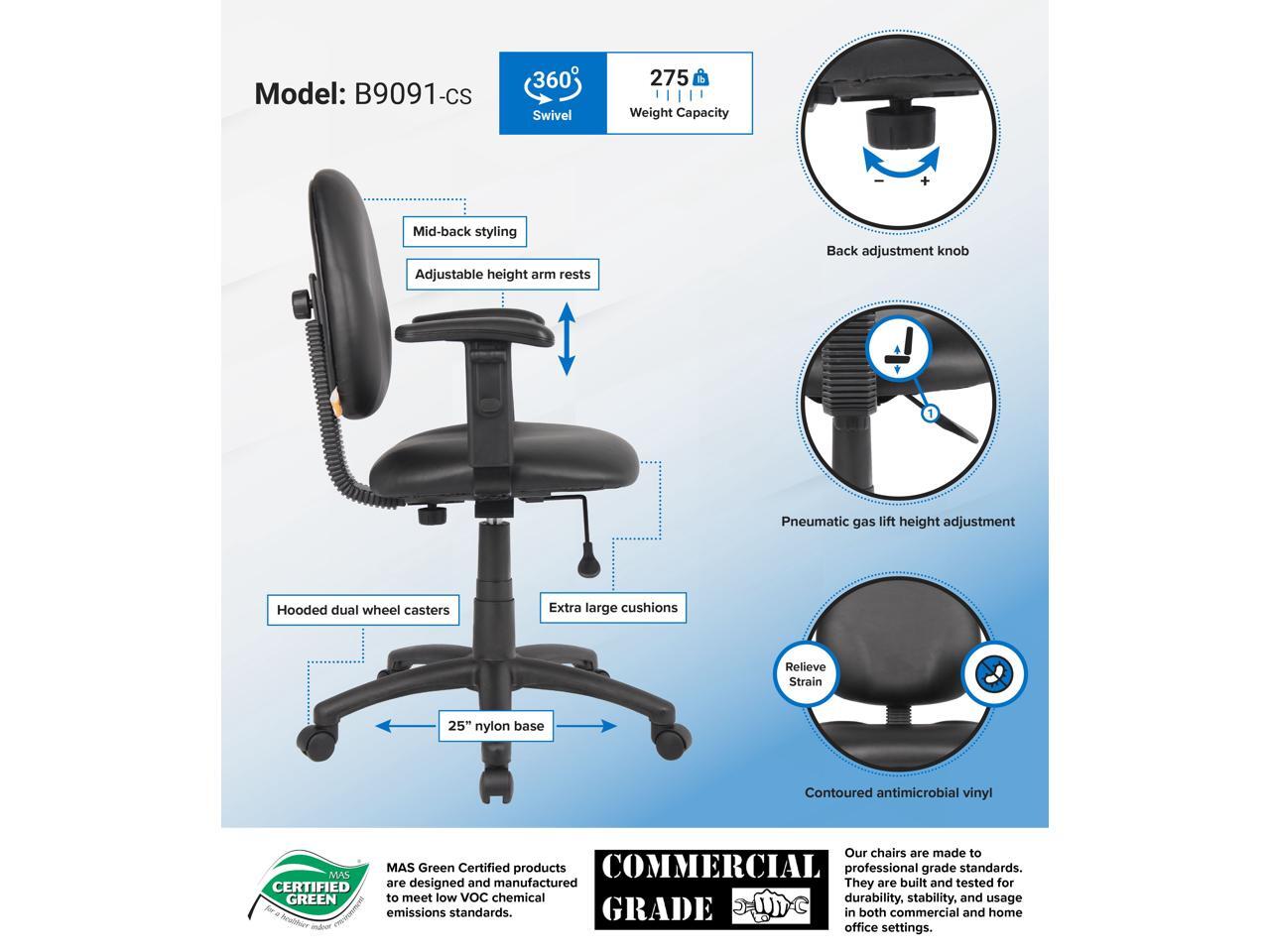 - Its contoured back seat promotes proper posture that prevents back strain, while its extra large seat and back cushions ensure maximum comfort Additional features include adjustable arms, pneumatic gas lift seat height adjustment, black antimicrobial vinyl upholstery, and adjustable back height and depth