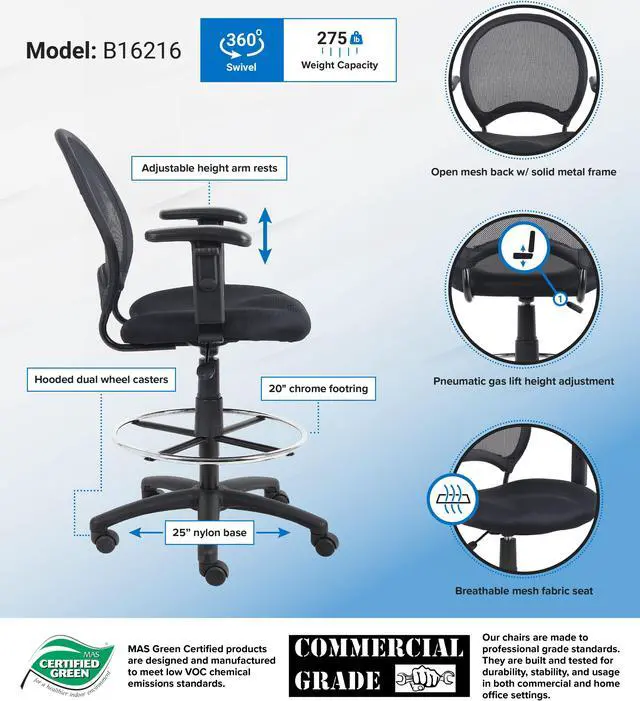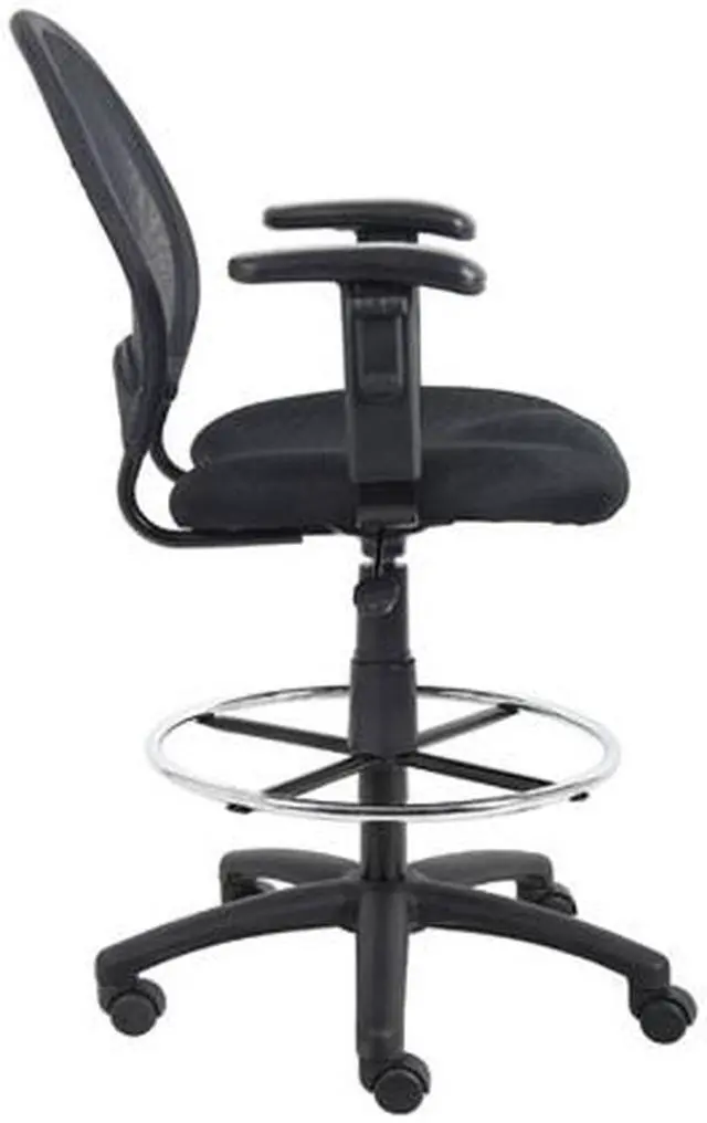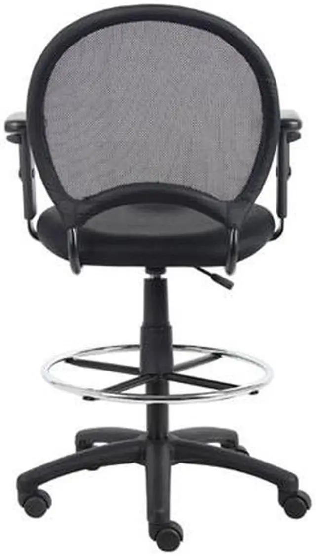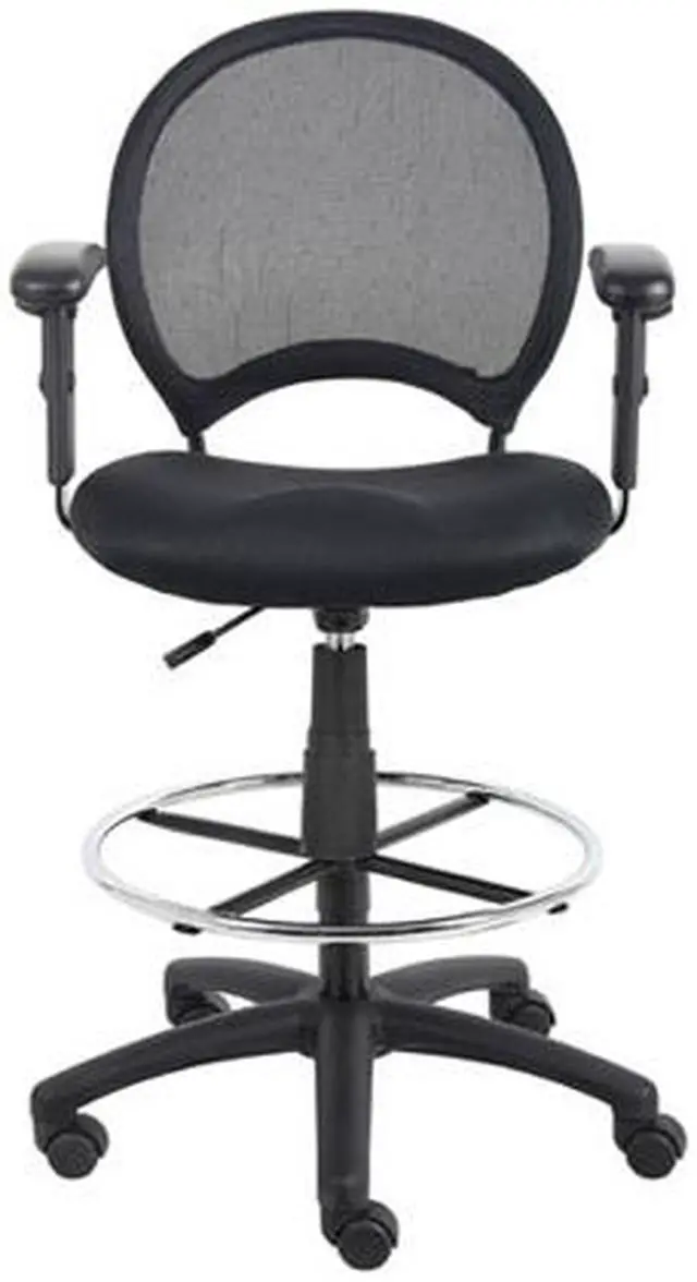 The Mesh Drafting Stool from Boss Office Products features an open-mesh back that prevents body heat and moisture from building up while you work. The solid metal frame is covered with durable ballistic nylon, and the breathable mesh fabric seat comes with ample padding. The nylon star base has a convenient chrome foot ring. Use the pneumatic gas lift to adjust your seat height. Rolls easily on five dual-wheel casters. Give your office a brand new seating space with this mesh back drafting stool.