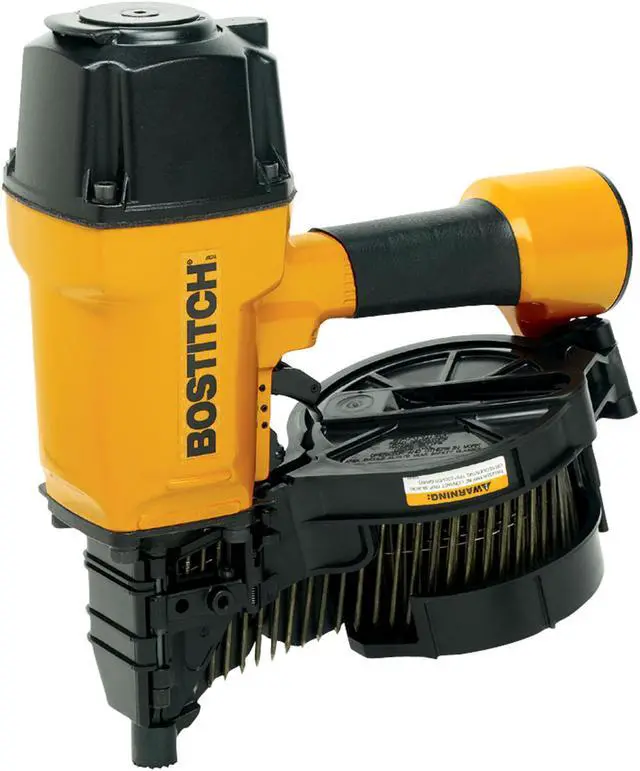 Bostitch 15° Coil Framing Nailer has large capacity coil magazine that holds up to 300 nails for increased productivity. Easy contact-trip trigger with aggressive toe-nailing teeth grip lumber for slip-free nailing. Durable aluminum housing and heavy-duty, quick-open canister is designed to be tough to handle falls. Air Framing Nailer, Full Rnd, 15 Deg, Wire