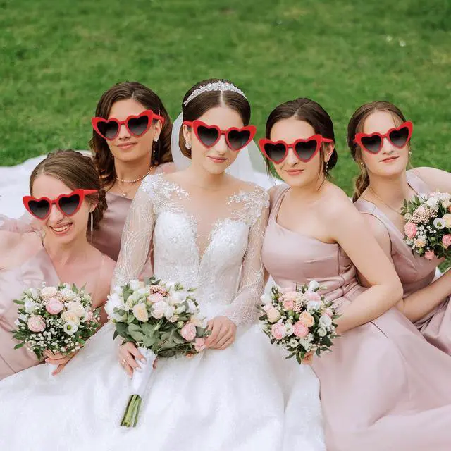 Size: The total length of bridesmaid sunglasses is 15.3cm/6.02inch, the single frame height is 6.2cm/2.44inch, the single frame length is 7cm/2.75inch, the temple length is 14.5cm/5.7inch, the nose bridge is 1.3cm/0.51inch. Suitable for most face shapes