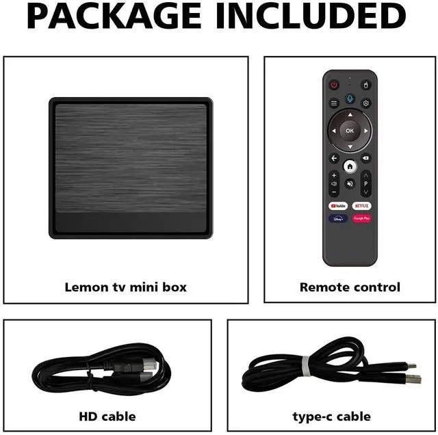 The Lemon TV Mini Android TV Box delivers smooth 4K playback with seamless OTA updates to keep your device running at its best. It features a user-friendly interface for easy app installation and management. With intuitive remote button controls, switching between videos is faster and more precise than web-based browsing. For a digital manual, please contact our support team. Enjoy simple, reliable, and high-quality streaming for your home entertainment.