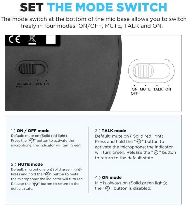 The BY-GM18C Podium Microphone has "ON/OFF,MUTE,TALK and ON" 4 modes. Talk/MUTE status is clearly indicated by the LED indicator.