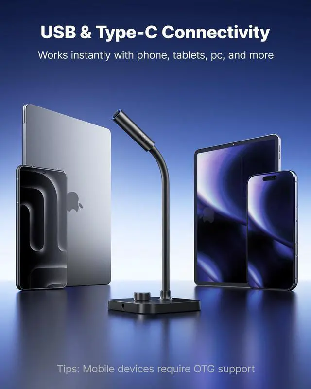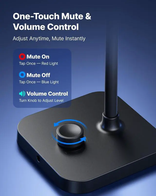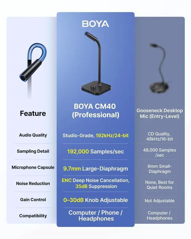 Easy Control & Stable Base: BOYA gooseneck microphone features stepless rotary knob for 030 dB gain control plus one-touch mute; 360° flexible gooseneck and anti-slip silicone base ensure easy positioning and rock-solid stability.