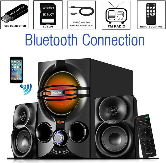 Frequency range: 40 Hz-20 kHz - satellite rated power: 4"8 ohm wired/wireless Bluetooth connection to stream wireless music from the tablets, smart phones, laptops, iPad, iPhone and more. Volume controls on the sub-woofer, output total power is 40 watt with 5 inch sub-woofer speaker. Pairs quickly and easily with your unit. USB/SD/wireless remote control with FM radio and digital display. Listen to your music loud and clear. Built in MP3 player included, it could automatically play the music with a standalone micro SD card. Custom designed and engineered by Boytone - an industry trusted brand for over 33 years.