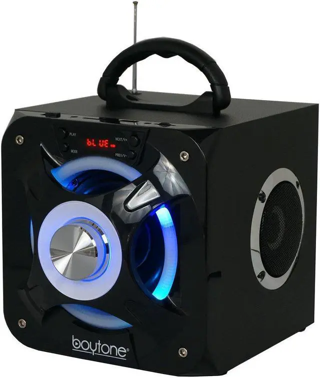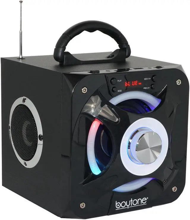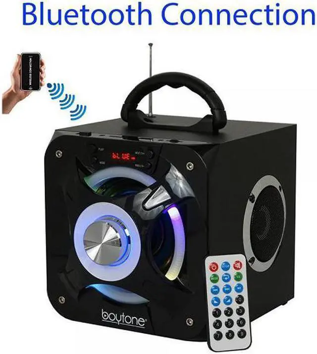 Description • The Boytone BT-32D Wireless Bluetooth & Portable FM radio Speaker Systems combines high-powered sound and visual style • The built-in flashing DJ party lights illuminate the area to add a cool effect while your wireless music plays. • Bluetooth music streaming allows you to connect and stream audio from all of your favorite devices (like Smartphones, Tablets, Laptops, etc. ). • The built-in rechargeable battery makes this sound system extra portable - to party on the go • Rechargeable battery (1000 mha built-in for over 8 hours of play • Additional music streaming options include FM Radio with Digital LCD Display, USB Flash and micro SD Memory Card Readers, Portable Bluetooth Speaker System, built in rechargeable battery • Dynamic, powerful speaker system • 1/8" auxiliary input • Disco light • Remote control Package Contents • Boytone BT-32D Portable Bluetooth FM Radio Stereo speaker System • Remote Control • User Manual