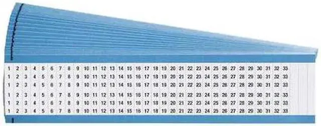 Wire Marker, Preprinted, Legend 1 to 33, Color Black on White, Markers per Card 33, Material Vinyl Cloth B500, Temp. Range 175 Degrees F, Label Width 0.25 in, Label Height 1.5 in, Marker Attachment Style Repositional Self-Adhesive, No. of Labels 825, Label Material Vinyl Cloth, Background Color White, Legend Color Black, Standards RoHS Directive compliant to 2005/618/EC MCV, Package Quantity 25. This item has been restricted from sale in the following state (s): []