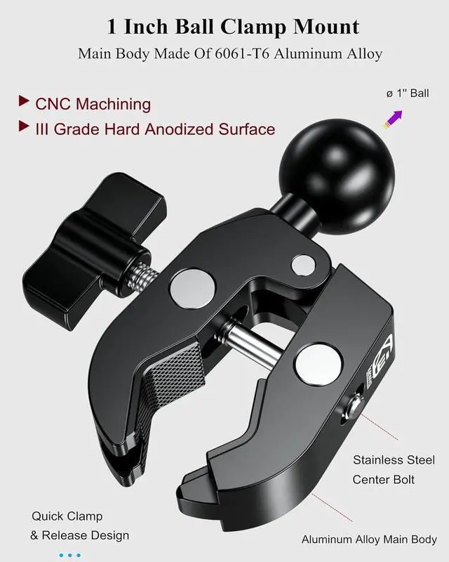 The 1 inch ball handlebar clamp mount compatible with RAM Mounts & BRCOVAN any B size 1'' ball double socket arms. Also works for other devices with 1'' swivel ball mounting pattern. Main body made of 6061-T6 aluminum alloy material for durability and reliability in the most demanding environments. CNC integral molding, solid structure. Anodized surface treatment, smooth surface, durable. TPU overmolded ball head, non-slip and wear-resistant.