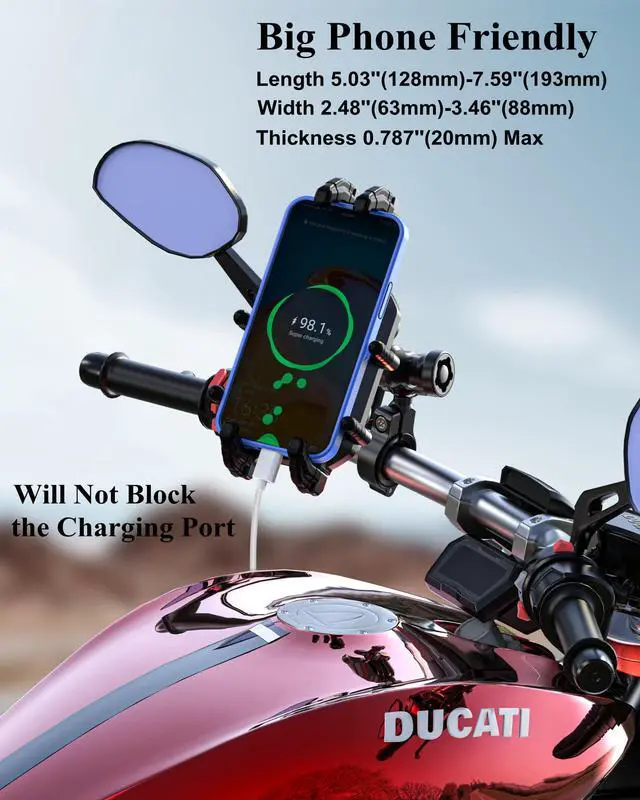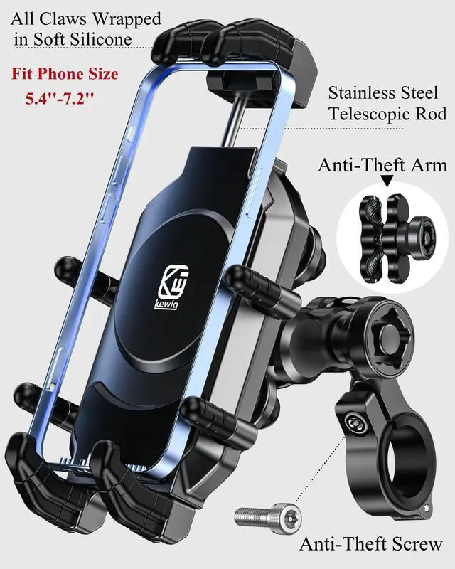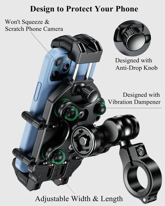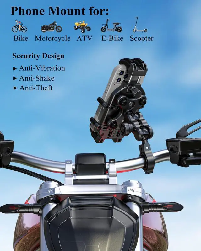 The motorcycle phone mount with vibration dampener and high-speed secure lock, using metal anti-theft handlebar mounting base and double socket arm, fit for handlebars 0.875''(22mm) / 1.0''(25.4mm) / 1.125''(28.6mm) / 1.26'' (32mm) in diameter, 720-degree rotation design, adjustable fit 5.4-7.2'' smartphones, suitable for motorcycle, bike, bicycle, scooter, ATV