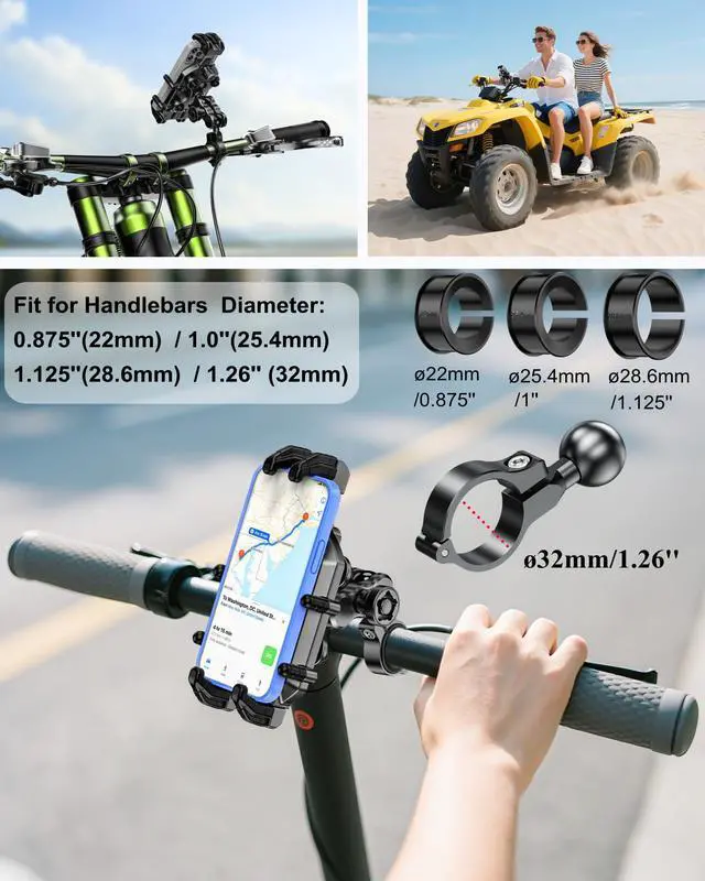 - Easy To Install: Accessories included with the package allow this atv phone mount easy to attach to handlebars . Fit for handlebars 0.875''(22mm) / 1.0''(25.4mm) / 1.125''(28.6mm) / 1.26'' (32mm) in diameter. Suitable for bike, bicycle, motorcycle, stroller, mountain bike, dirt bike, trek bike, road bike, golf cart, electric scooter, ATV, etc.
