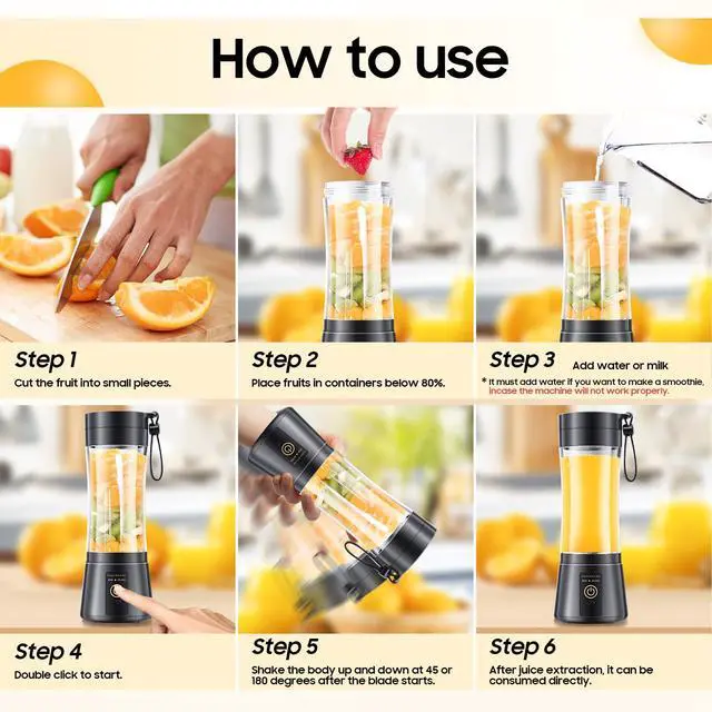 • Health & Safety MaterialsThis personal blender is made of carefully selected healthy materials, using food-grade materials, BPA-free, safety and health are guaranteed, drink with confidence. The body is temperature-resistant and not easy to break, and the bottom of the machine is stable and does not shake.
