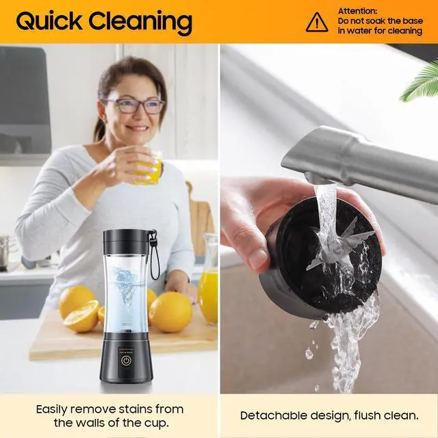 • Rinse With Ease Don't worry about the small blender being difficult to clean, this mini blender is easy to disassemble and wash, add water to the cup, start the button, use the whirlpool to rinse it, free your hands. Tips: For your safety, do not soak portable blender in water.