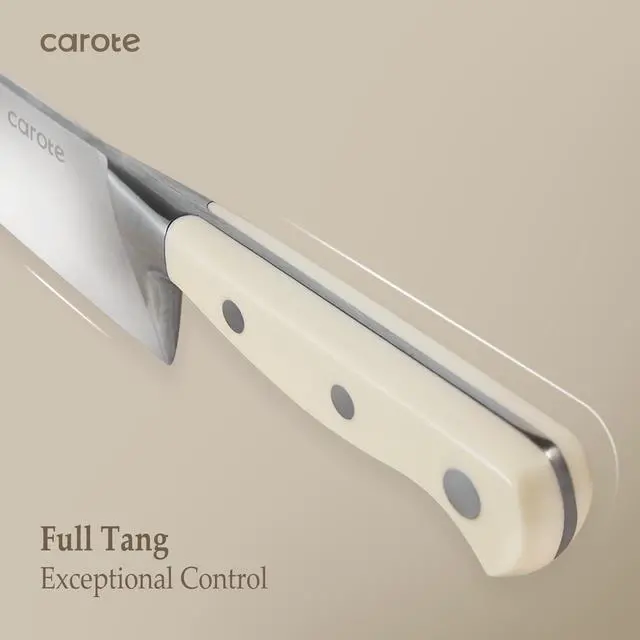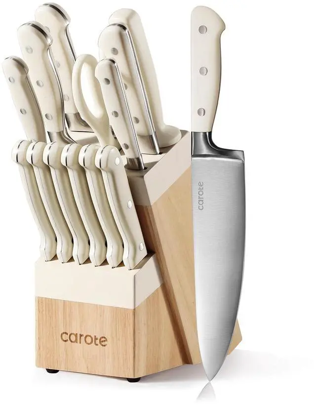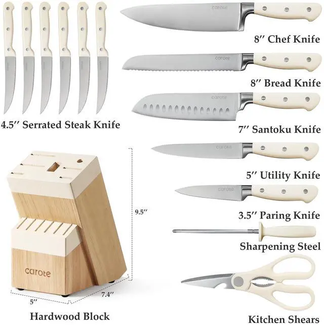 knife set with block is constructed with German stainless steel, ensuring long-lasting performance. The blade is razor-sharp that effortlessly glides through various ingredients allowing you to experience precision cutting like a professional chef.