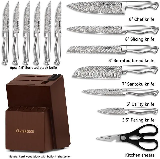 | Included Components | 6 Pcs 4.5" serrated steak knife, 7" Santoku knife, 8" Chef knife, 8" Serrated bread knife, 8" Slicing knife |