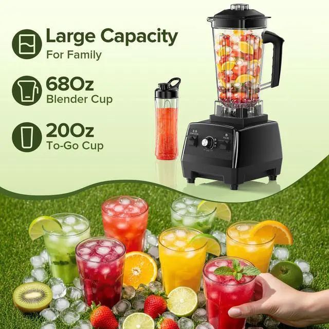 Large Capacity: Features a 68-ounce blending jar for processing multiple servings at once. Along with a 20-ounce portable cup, it offers convenient "blend-and-go" portability, perfect for making smoothies or juices.