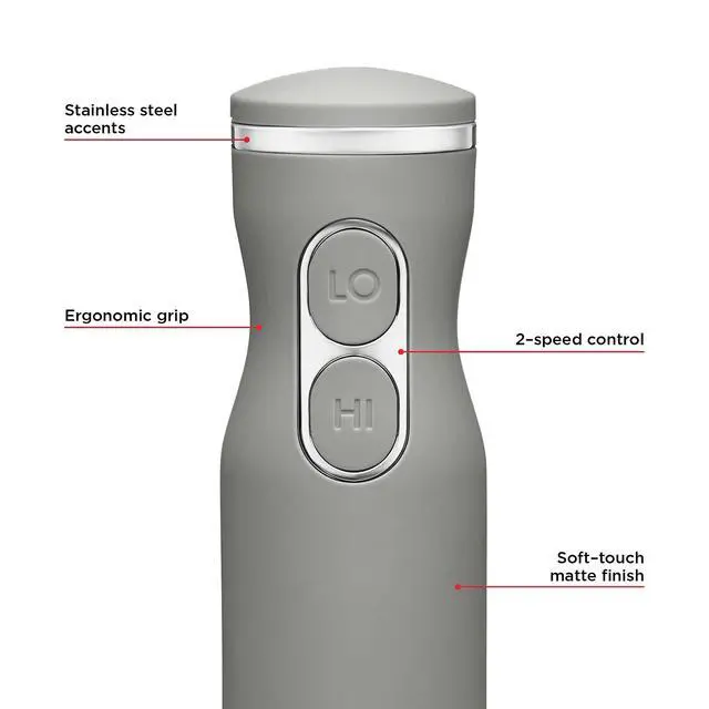 The soft-touch and easy-grip handle features one-touch buttons for high and low-speed control.