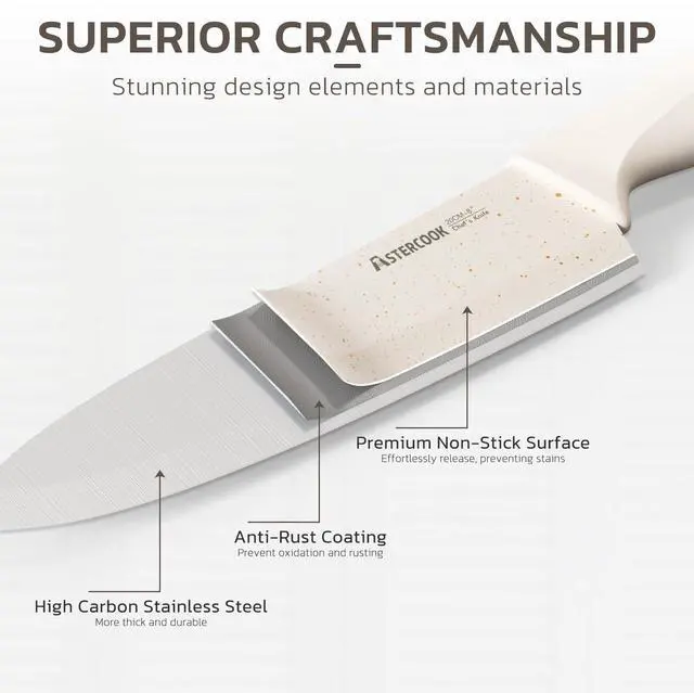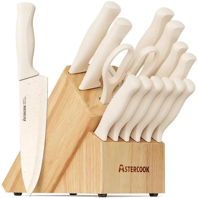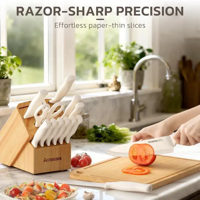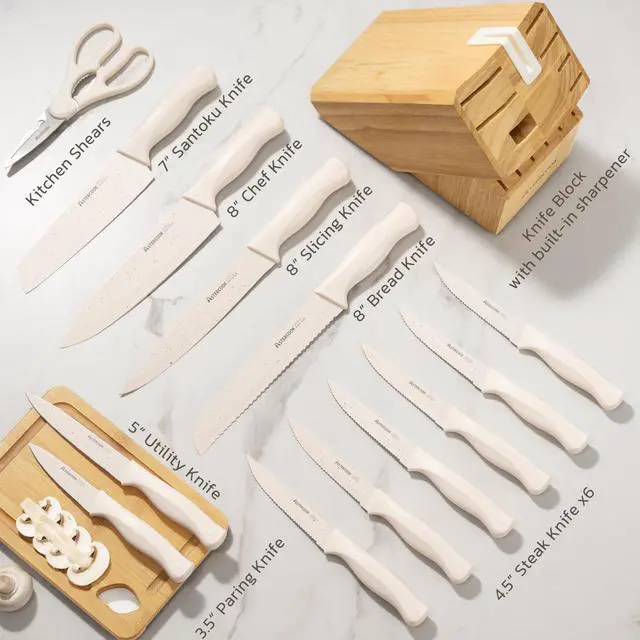 | Included Components | 3.5" Paring knife, 1 Pcs kitchen shears, 6 Pcs 4.5" serrated steak knife, 7" Santoku knife, 5" Utility knife, 8" Chef knife, 8" Slicing knife, 8" Serrated bread knife, Block and Sharpener |