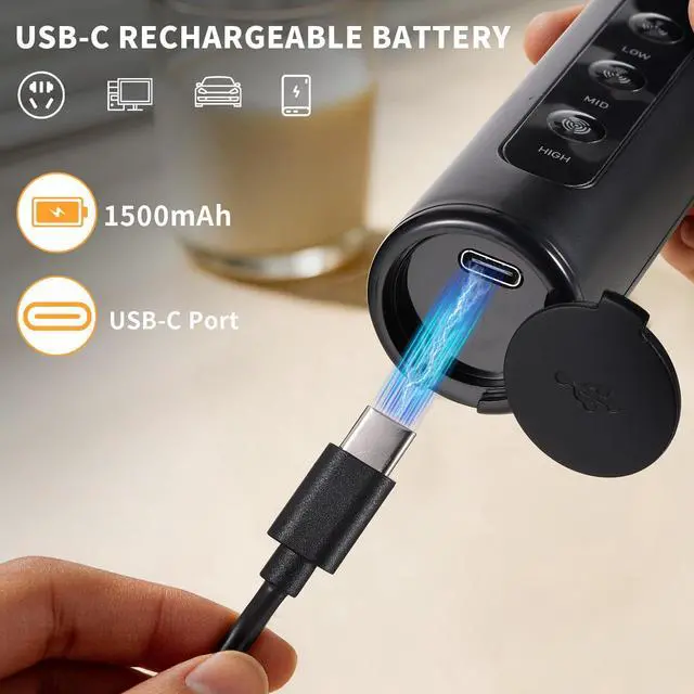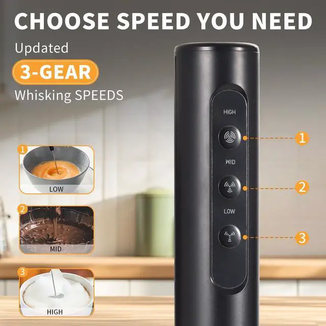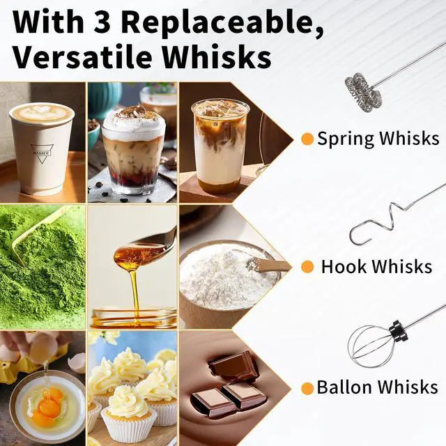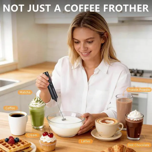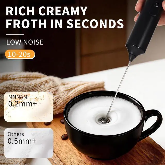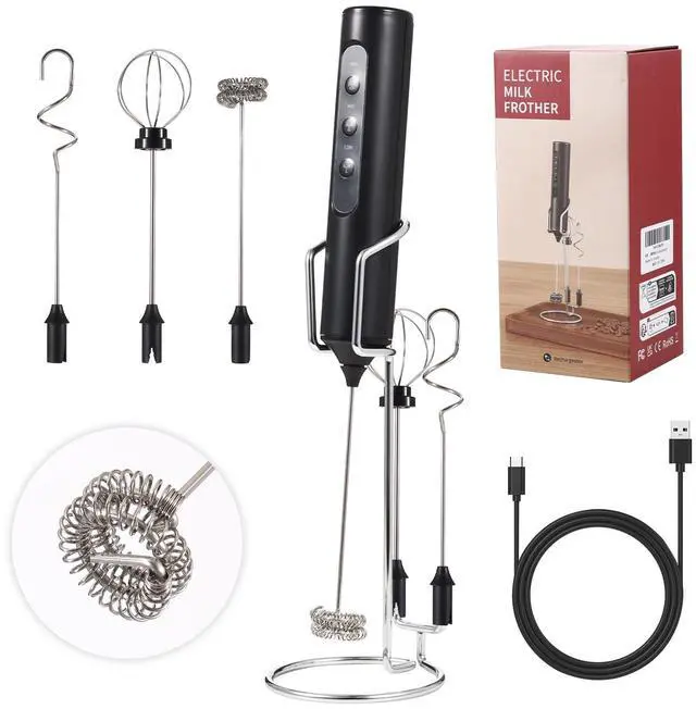 Rechargeable Milk Frother handheld: Be Your Own Barista - Use the good Barista Tools Handheld Electric milk frother rechargeable can help transform your daily drinks into cafe-style creations in seconds. The small handheld frother for drinks or small handheld mixer for drinks delivers silky foam and rich, velvety froth for your lattes, cappuccinos, matcha, hot chocolate, and protein shakes. More than just a foam machine or milk foamer or cold foam frother, its your all-in-one kitchen wand and drink mixer wand and hand held frother wand for whipping cream, mixing batters, blending powders, and crafting fluffy eggs.The rechargeable handheld frother whisk with stand is a good whipping machine in kitchen. Forget about other battery whisk frother and battery-operated milk frother. Our built-in rechargeable battery frother handheld offers long-lasting power. Designed for Effortless use lightweight, and quiet, the small electric whisk or small hand mixer feels comfortable in your hand. The small frother handheld compact design comes with a stainless steel frother stand,So that the milk frother with stand can easy to store in the kitchen, take it to the office, or bring it on trips. Whether as coffee lovers gifts for women, gifts for mom,gifts for dad,gifts for him,gifts for her,gifts from daughter,gifts for boy friends,gifts for girl friends, this handheld milk frother makes good gift for birthdays, holidays, housewarmings. Our coffee mixer is a great addition to coffee bar accessories,kitchen accessories,coffee accessories,coffee accessories for coffee bar,espresso accessories,barista accessories. So that the hand mixer electric handheld can help you make barista-quality foam in seconds. handheld mixer has three stainless steel detachable whisking heads which can be used as:matcha whisk,frother wand,coffee stirrers,electric whisk,coffee mixer wand,drink stirrers. 3 speeds, powerful and low noise Low: Perfect for stirring powders, stirring egg yolks and egg whites, powder drink, and other mixing. Medium: Ideal for matcha, jam, matcha tea, creamy froth High: Creates dense, creamy foam for milk, coffee, whipped desserts, and whipped cream in moments. Complete matcha Whisk Set for Every Task The stainless steel milk frother Includes 3 stainless steel whisks: SPRING WHISK, BALLOON WHISK, HOOK WHISK