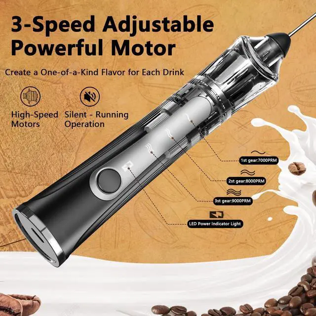 - 3 Adjustable Speed Modes: Choose between 7000RPM, 8000RPM, and 9000RPM for customized frothing and mixing performance.