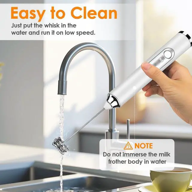 Note Our electric hand mixer is very powerful. Do not fill the container more than 1/3 full of milk, otherwise the milk may overflow from the container. The body of the milk frother is not waterproof, please do not immerse it in water.