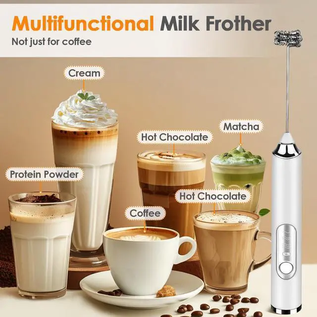 Milk Frother Handheld, Rechargeable Coffee Frother Wand with 2 Stainless Whisks 3 Speeds, Drink Mixer, Electric Foam Maker, Hand Mixer for Lattes, Cappuccino, Matcha, Egg, White