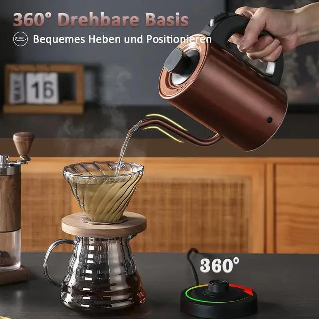 Copper-colored retro design- This unique gooseneck kettle impresses with its high-quality copper-colored housing, which combines vintage style with modern functionality. The matte surface is not only attractive, but also fingerprint-resistant and easy to clean - simply wipe with a soft cloth. Thanks to its compact design, it fits even in the smallest kitchen. A real eye-catcher for design lovers!