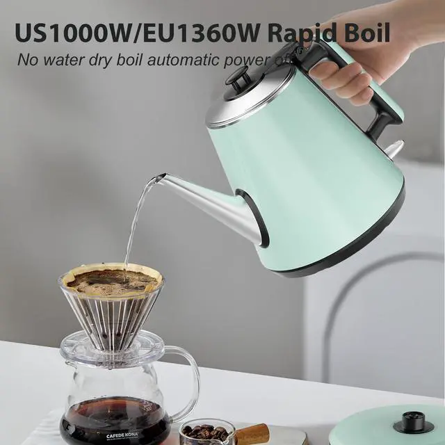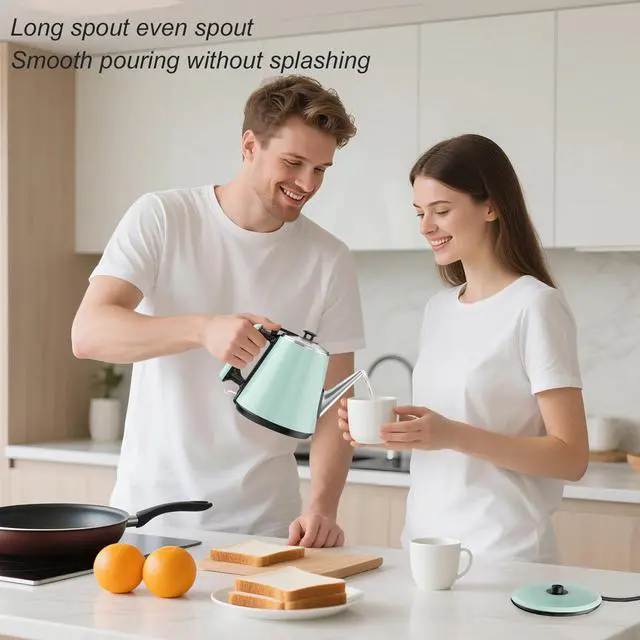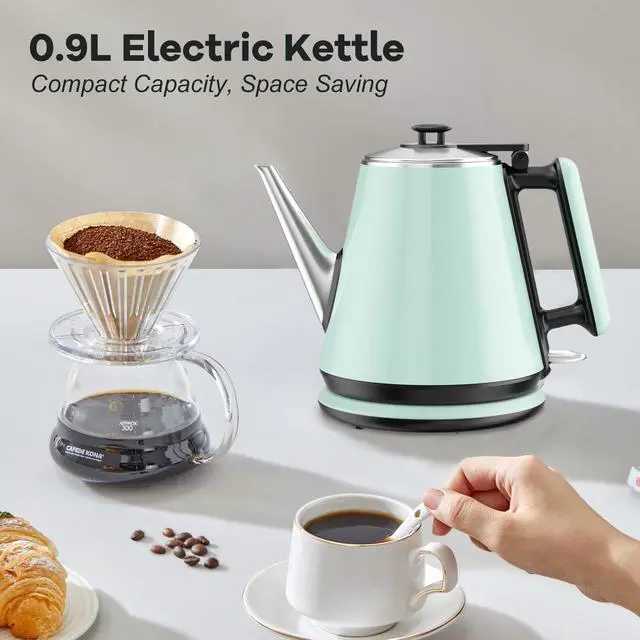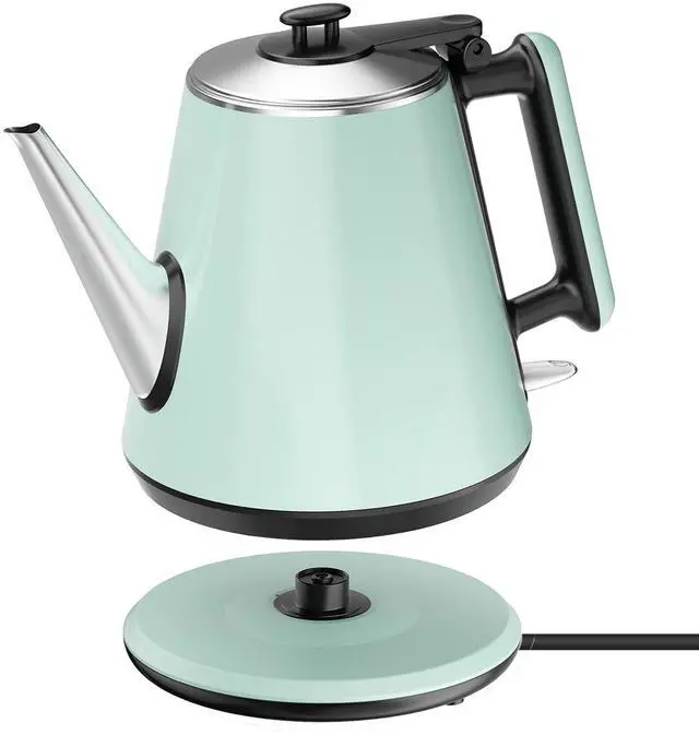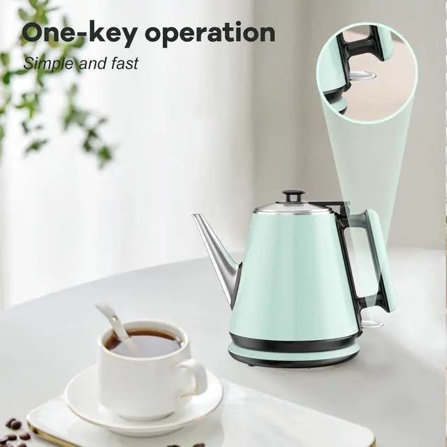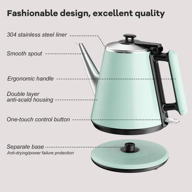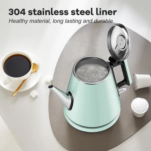 0.9L Compact Size, Space-Saving- Designed for small kitchens, dorms, or offices, this 0.9L electric kettle saves counter space while delivering enough hot water for 2-3 cups. Features a food-grade 304 stainless steel interior for hygiene and safety, paired with a heat-resistant plastic exterior for durability. Its mint green retro design adds a modern touch, perfect for coffee lovers or small households.
