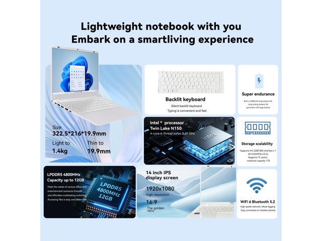 BRENUC Business Laptop, LPDDR5 12GB RAM 512GB 5SD, Win11 Pro Computers, 14" 1920 x 1080 Screen, Intel N150 CPU, Backlight Keyboard, Fingerprint Reader, Webcam, White