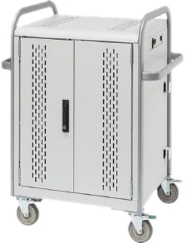 | Features | Laser cut numbers for identification on every device slot. Polypropylene shelf dividers store 30 devices vertically and protect them from scratching. Includes a sophisticated power manager that continuously analyzes power requirements and efficiently charges devices in a round robin cycle, – all from one 15 Amp electrical circuit. The power manager allows for use of the auxiliary outlet on the exterior of the cart while the batteries are charging. Full-access double doors in the front for the user and optional full-access double door in the rear(MDMTAB30) or removable back panel (MDMTAB30BP). Front cable management conveniently positions power cords to plug into devices. Cord management in the back of the cart features laser printed numbers and adapter storage bins. Dual-handle design for safe and easy mobility. Security is provided by the solid steel construction and all steel swing handle with programmable padlock. Perforated exterior to help keep devices cool. Side panel includes a cord winder to keep the power cord neat and out of the way when not in use. Easy rolling 5" all swivel locking casters for tight spaces that, when in fixed position, provide added directional control. Ships fully assembled and ready for use. Constructed using an average 30% post-consumer recycled steel content and finished in environmentally friendly powder paint. Steel components are 100% recyclable at the end of the product life cycle. The Pulse 30S has achieved GREENGUARD GOLD Certification and is UL 60950-1 Certified for Safety of Technology Equipment. |