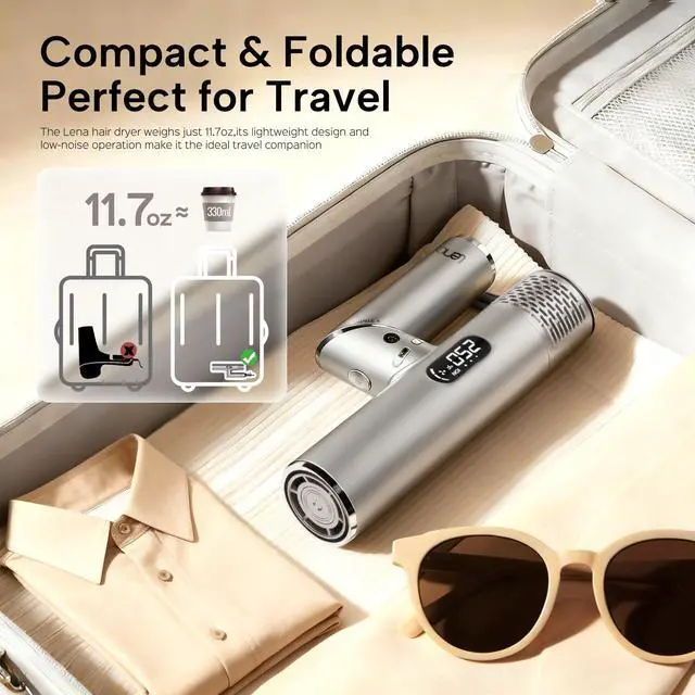 Compact & Foldable, Perfect for TravelDesigned for ultimate convenience, the Lena hair dryer weighs just 11.7oz (331g) with a foldable body, making it compact and easy to store in bags, purses, or carry-ons. Its lightweight design and low-noise operation make it the ideal travel companion, ensuring a quiet drying experience wherever you go, so you can maintain a perfect look anytime, anywhere.