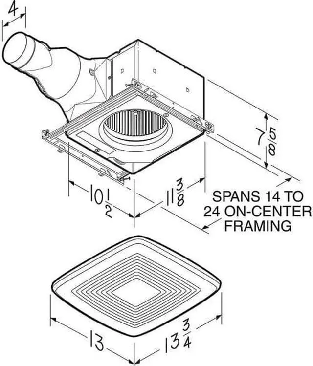 Bathroom Fan, CFM @ 0.100 -In. SP 110 cfm, Sones @ 0.100 -In. SP @ 5 Ft. 0.6, Duct Dia. 4 in, Horizontal Discharge, Voltage 120V AC, Lighted No, Night-Light No, 60 Hz Hz, 1 Phase, Heater No, Heat Watts 0, 0.3 Amps, Watts 29.8 W, Grille Length 13 in, Grille Width 14 in, Housing Height 7 5/8 in, Housing Length 10 1/2 in, Housing Width 11 3/8 in, Housing Material Metal, Mounting Location Ceiling, Number of Speeds 1, Profile Medium, Motion Sensing No